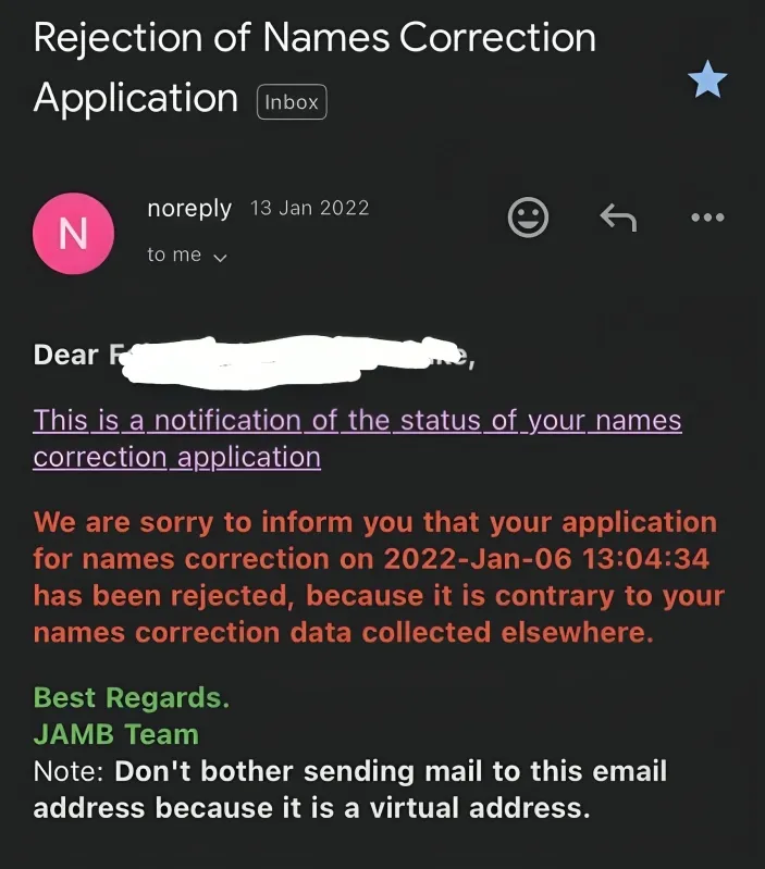 Immediately after NIMC corrected, Akinwande submitted the same name correction request to JAMB, expecting the examination body to align its records with the updated information. Instead, JAMB rejected her application in January 2022, stating that the request was "contrary to my name correction data collected elsewhere."