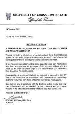 The University of Cross River State has issued a reminder to all students who applied for loans under the Federal Government NELFUND Loan Scheme to verify their application status and collect their school fee payment receipts.